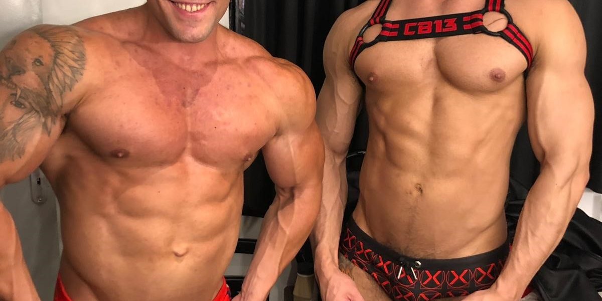 PHOTOGRAPHIE PRINCIPALE : En backstage, Seth Santoro et Leon Klen, portent respectivement le speedo Monogramme Wrestlingmale et le speedo ligne classique taille basse Triclolore, version rouge.