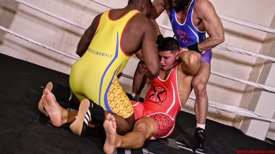 Le trio de muscle hunks en singlet aux couleurs flambant neuves brille sur le ring….